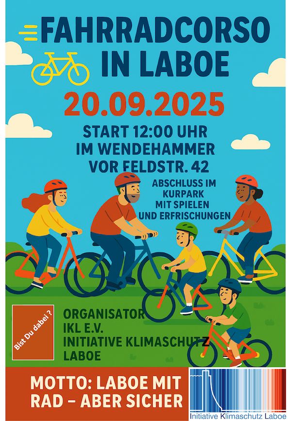 Unsere Partner-Initiative, die Initiative Klimaschutz Laboe e.V. (IKL), lädt am Samstag, den 20. September 2025, zum ersten Fahrradcorso in Laboe ein. Start ist um 12:00 Uhr am Wendehammer vor der Feldstraße 42. Mit dem Fahrradcorso will die IKL ein deutliches Zeichen setzen: für mehr Sicherheit auf dem Fahrrad und für eine bessere Fahrradinfrastruktur im Ort. Denn ob Kinder, die ab der vierten Klasse mit dem Rad zur Schule fahren dürften, oder E-Bike-Nutzer, die lieber das Auto stehen lassen würden – viele Bürgerinnen und Bürger würden gerne öfter das Fahrrad nehmen, trauen sich aber nicht.
