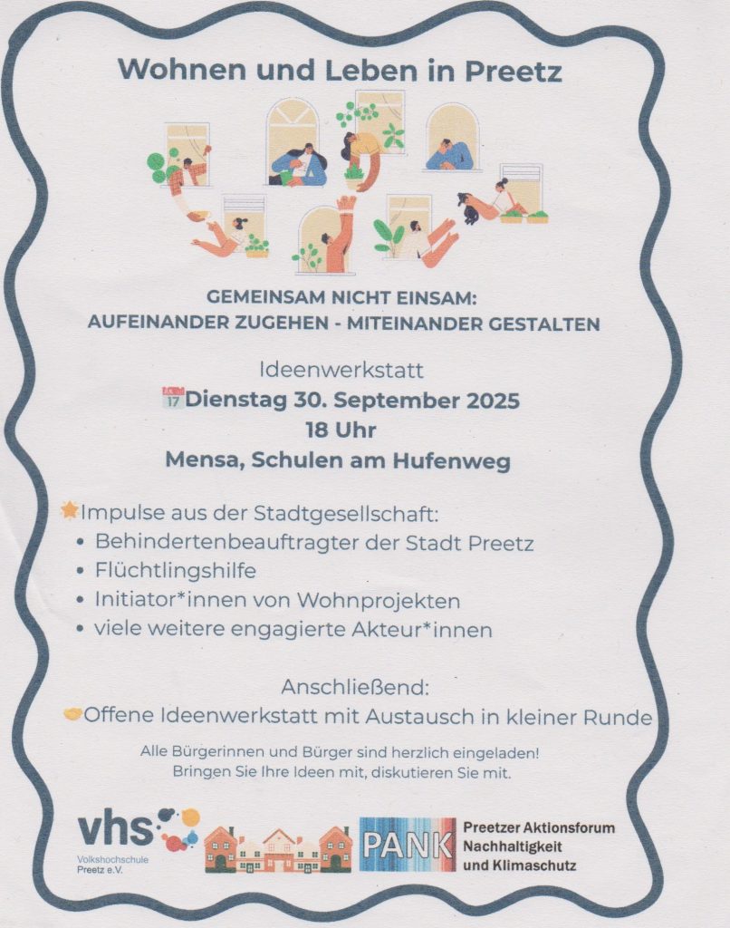 „Gemeinsam nicht einsam“ – das ist das Motto der von der VHS Preetz und PANK organisierten Ideenwerkstatt, die am 30. September um 18 Uhr in der Mensa der Schulen am Hufenweg stattfindet. Nähere Infos finden Sie hier auf der Seite.