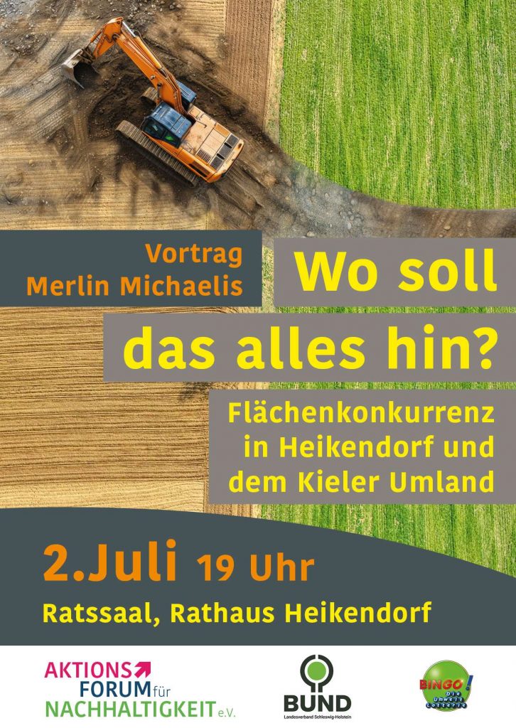 Im Rahmen des Projektes „Land FAIRteilen“ führt am 2. Juli das Aktionsforum für Nachhaltigkeit Heikendorf einen spannenden Vortrag unter dem Titel „Wo soll das alles hin? – Flächenkonkurrenz in Heikendorf und dem Kieler Umland“ duch. Referent ist Merlin Michaelis, Referent für Flächennutzung beim Bund für Umwelt und Naturschutz Deutschland (BUND), Landesverband Schleswig-Holstein e.V.