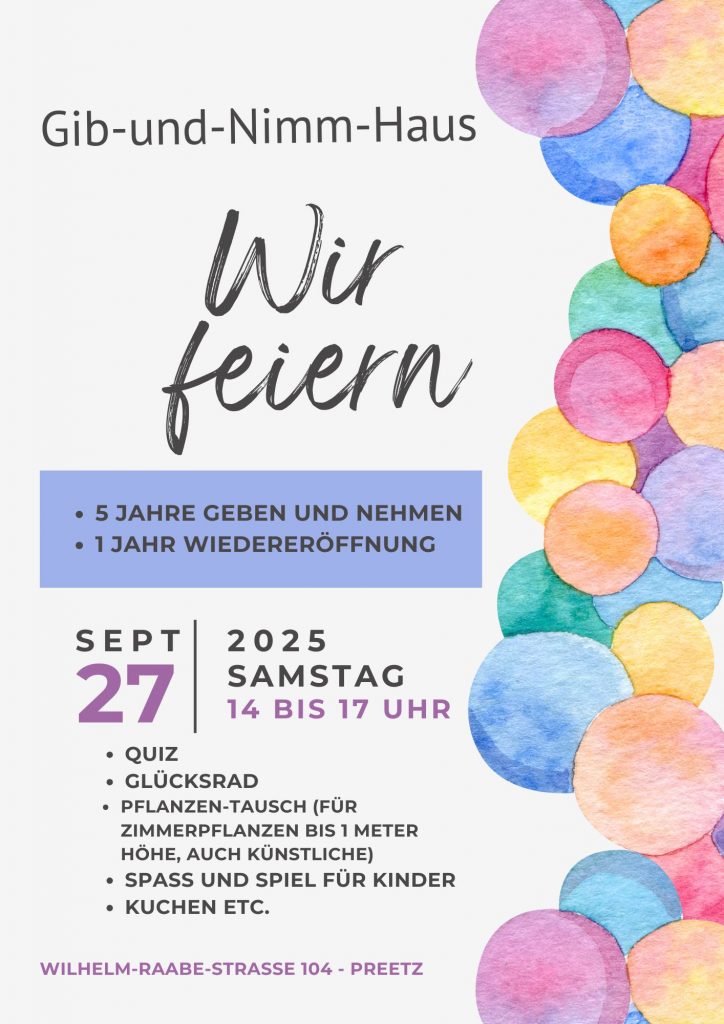 Wir würdigen das Doppel-Jubiläum am Samstag, 27. September, von 14 bis 17 Uhr mit einem kleinen Fest. Mit Glücksrad, Quiz, Zimmerpflanzen-Tausch, Spiel und Spaß für Kinder … Kommt vorbei und feiert mit uns!