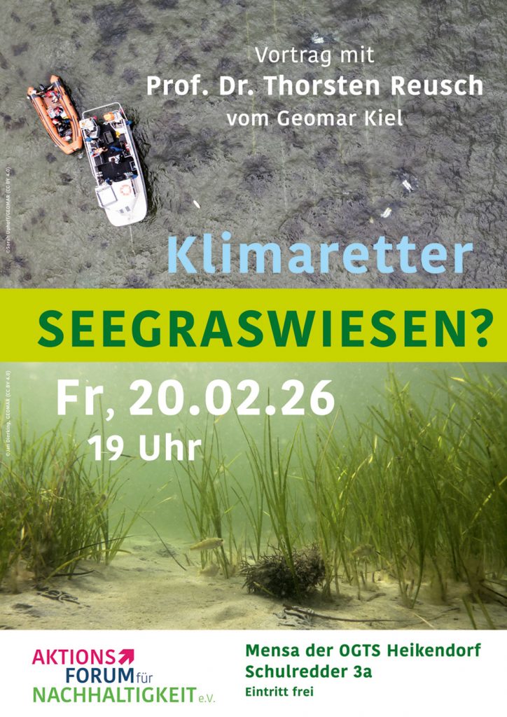 Unsere Partnerinitiative, das Aktionsforum Nachhaltigkeit, lädt zu einem nachhaltigen Vortrag ein: Am 20.2. geht es um das Thema „Klimaretter Seegraswiesen“ (mit Prof. Dr. Thorsten Reusch). Alle weiteren Infos können dem Veranstaltungsplakat entnommen werden.